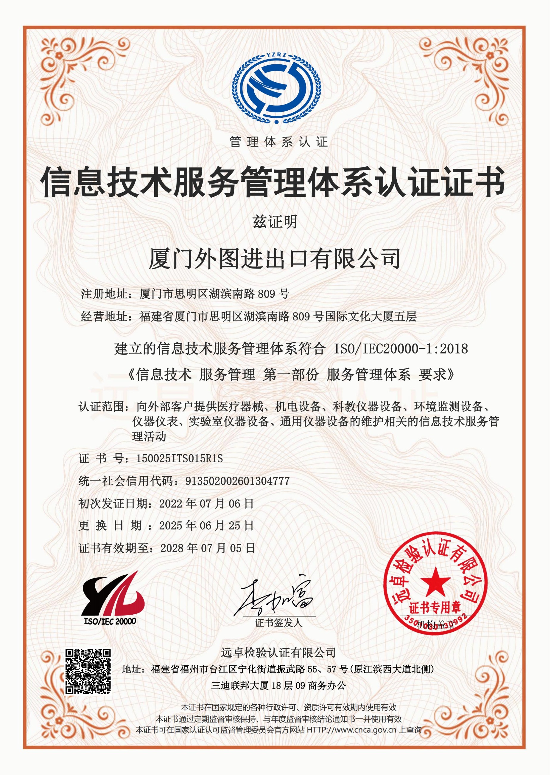 信息技(jì)術(shù)服務管理(lǐ)體(tǐ)系認證證書(shū)