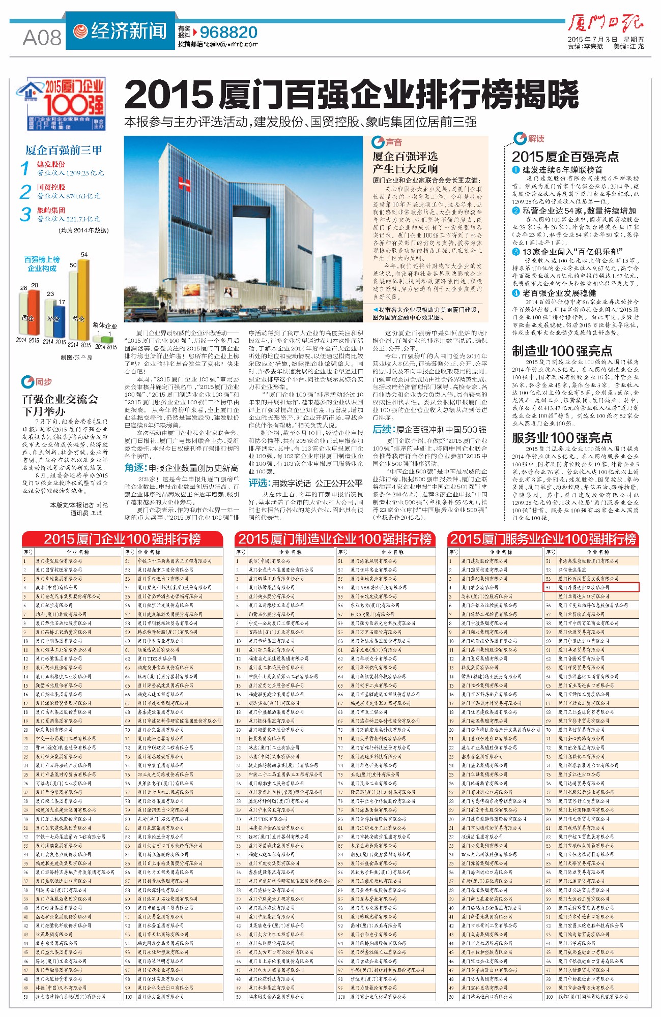 廈門(mén)服務業(yè)企業(yè)100強-2015年(nián)度